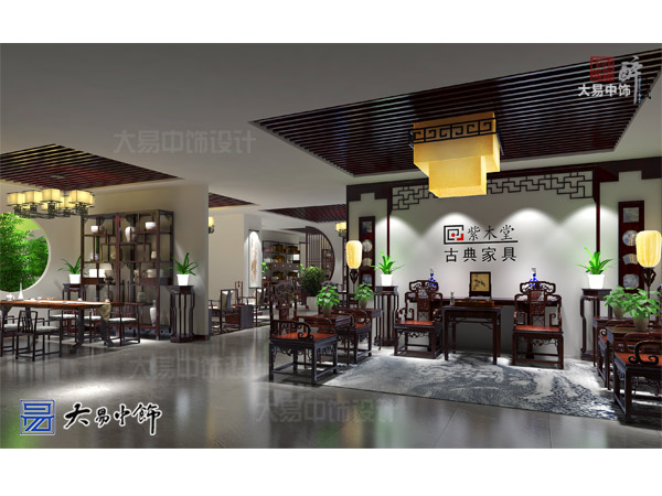 红木展厅进门处以中堂为中式设计主题,中堂背景用店面logo代替原有的中堂中式装饰中式装修。古色古香,典雅庄重的中堂中式家具既体现了中式传统文化,又显得沉稳大气。